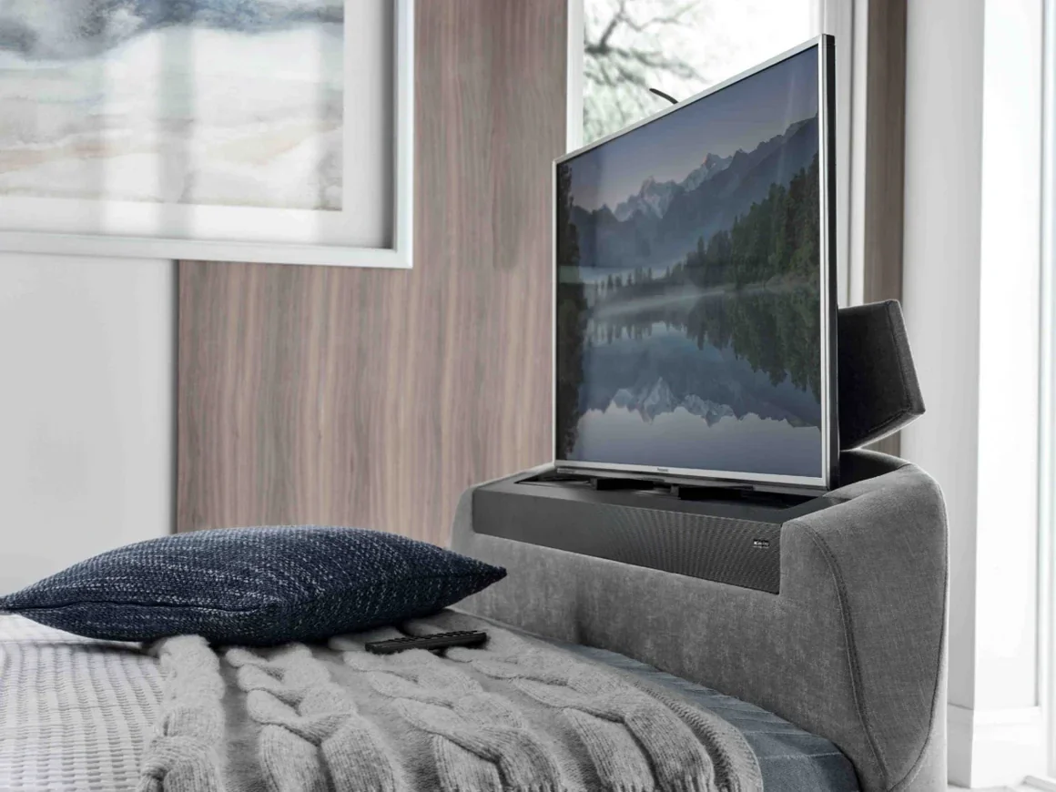Transform your bedroom into a luxurious entertainment suite with the Darras TV Bed. This premium tech bed combines sophisticated design with cutting-edge media technology, creating the perfect sanctuary for modern living. The striking slim vertical panel design with a padded headboard offers style and comfort. The integrated 5.1.2 Dolby Atmos surround sound system delivers an immersive cinema experience right from your bed. Stream Netflix for the perfect movie night, and enjoy YouTube tutorials or music videos while in this media bed. Connect your gaming console for an all-encompassing entertainment experience. Effortlessly control your entertainment with the included remote function and connect devices via Bluetooth, dual USB A&C ports, or HDMI connections. The sleek foot end houses up to a 43" TV that rises and retracts at the touch of a button. Crafted with quality upholstery and sustainable wood sources, this Darras TV bed is as eco-conscious as it is innovative.